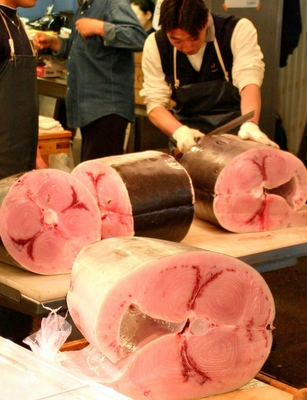 oh, and as for the big fish, yeah, it's sashimi for giants. they had them queueing up out back, eating barrel-sized slices of tuna off of immense granite slabs, but picking them up between thumb and forefinger so daintily you'd almost forget the fuckers were forty feet tall.