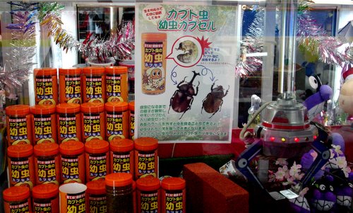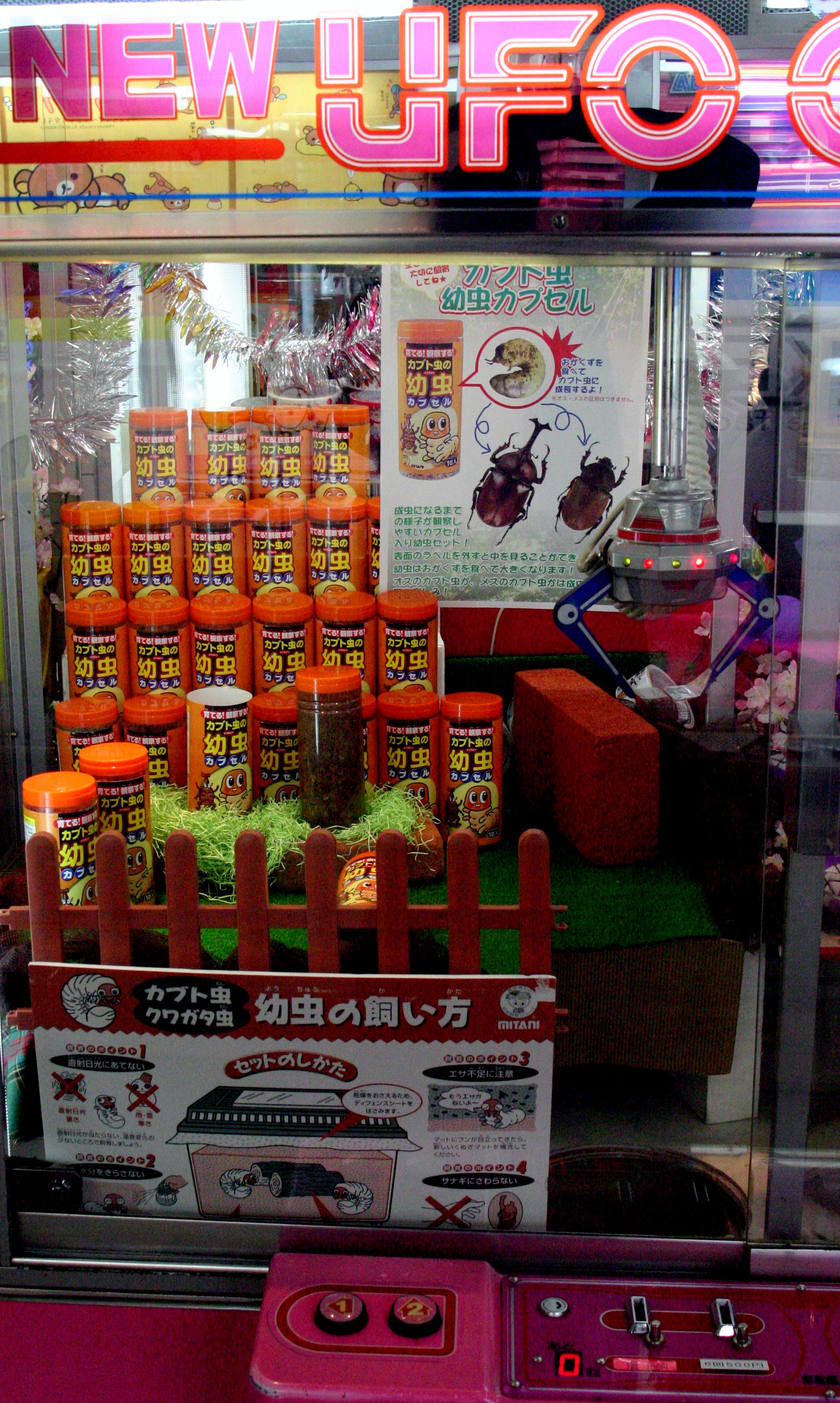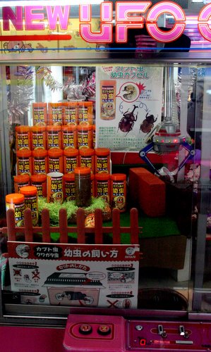 (these are not good pictures, but I had to take them b/c otherwise no one would believe me that there was one of those game machines where you put in money and get to move the crane around and the prize is beetle larvae.)