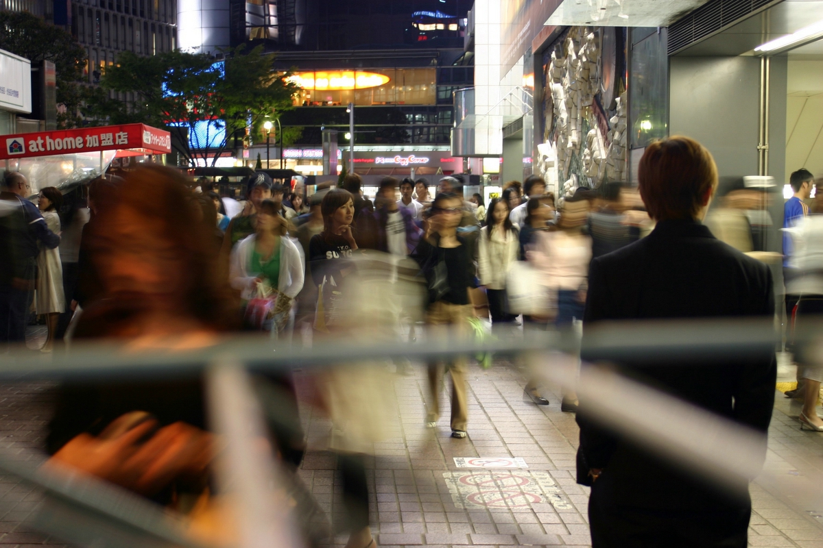 I set the shutter to stay open for half a second or so. Had the camera resting on that frame thing you see in the foreground. Turns out the individual on the right was just standing still, while everyone else was flowing around him.