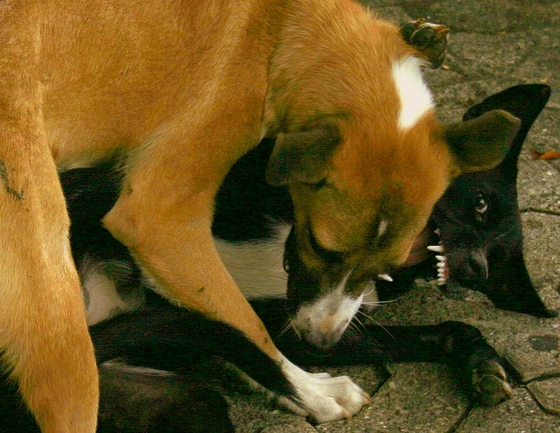 anne: they were definitely playing. no worries. they were happy and friendly dogs.