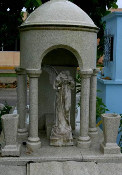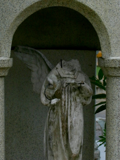 Maybe the angel just combined the "hear no evil, see no evil, speak no evil" into one and decided to remove its head?