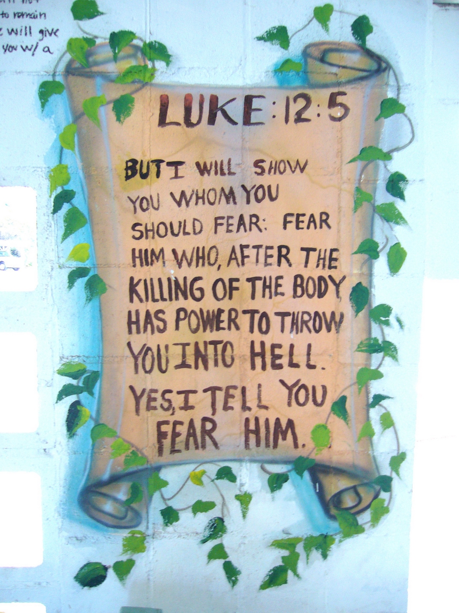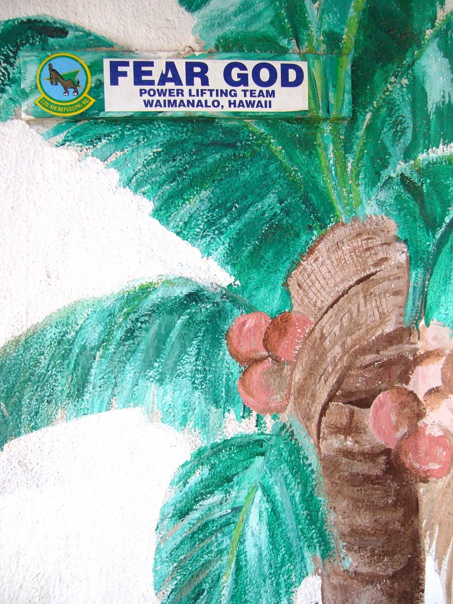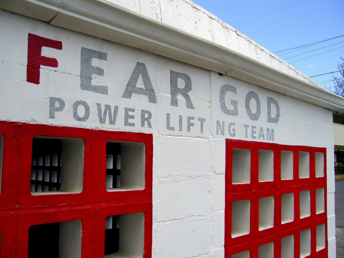 the way in which it makes sense is that a plate lunch is a gigantic plate of meat and carbs eaten by gigantic people, and powerlifting is done by gigantic people, and people who paint verses from Revelation on their wall are scary especially so when they are gigantic and lift enormous amounts of weight for fun. so, fear God, and the enormous people who are fond of the Revelation of St. John and picking up hugely heavy objects competitively.